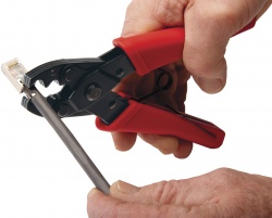 Perform 360° crimps on the external ground tab of shielded RJ45 connectors. Tool design allows the installer to perform a concentric termination with full control, preventing over/under crimping the external ground tab.