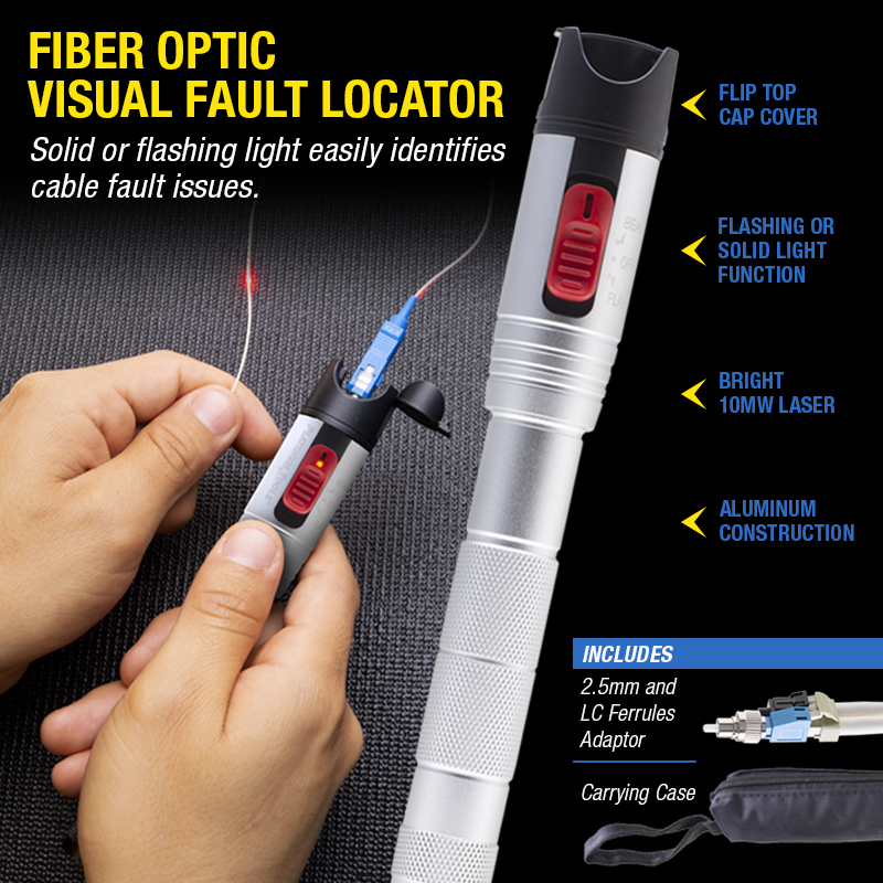 - Bright 10mW laser for continuity testing; also shows breaks and performance-reducing bends in most types of fiber optic cable